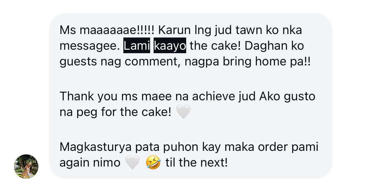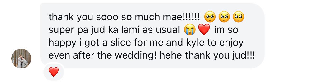 Her client list includes well-known names such as the Cokaliong and Gullas families, actress Katherine Hermosa, Jelma founder Dhanica Lim, influencer Geezelouiseeeee (Louie Chan), and even a birthday cake for Imee Marcos. Despite this, Mae remains grounded, focusing on consistent communication, dependable service, and a sincere effort to understand each couple’s style and flavor preferences.