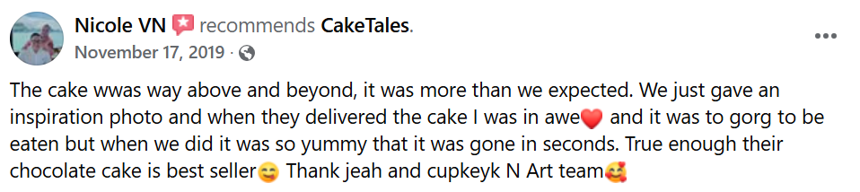 Clients appreciate CakeTales for their responsiveness, creativity, and the level of care that goes into each order. The cakes are baked fresh, made to order, and crafted with a strong emphasis on both design and craftsmanship.